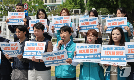 교사노동조합연맹, 전국교직원노동조합 관계자들이 지난 5월 8일 서울 종로구 정부서울청사 앞에서 고교학점제 폐지 서명운동 결과 발표 기자회견을 하고 있다. /뉴스1 © News1 임세영 기자