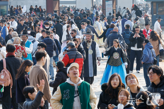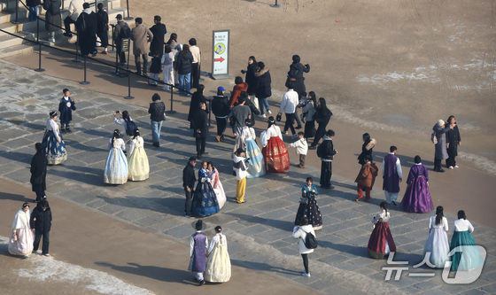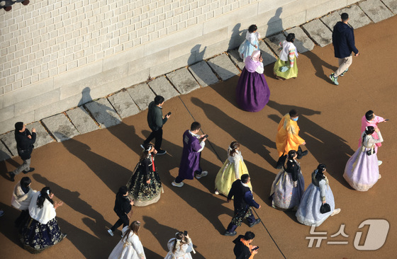 절기상 대설(大雪)인 7일 서울 종로구 경복궁 인근에서 관광객들이 포근한 날씨를 맞아 한복을 입고 나들이를 하고 있다. 2025.12.7/뉴스1 © News1 임세영 기자