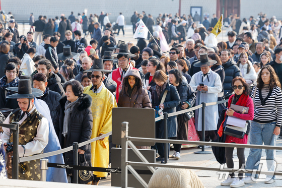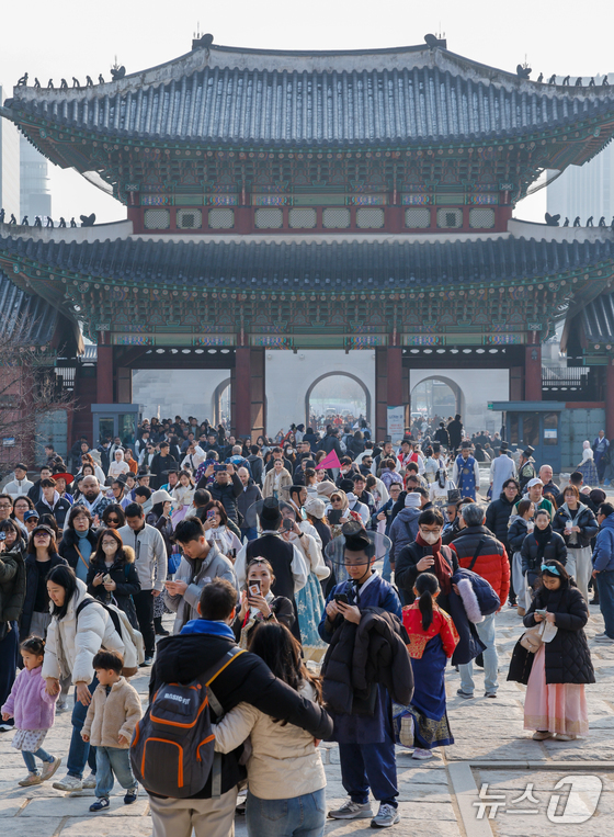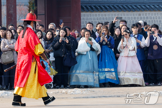 절기상 대설(大雪)이지만 서울 낮 12도 등 포근한 날씨를 보인 7일 종로구 경복궁에서 관광객들이 수문장 교대식을 보고 있다. 2025.12.7/뉴스1 © News1 안은나 기자