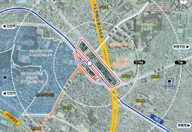 동인천역 도시개발사업 위치도. 동인천역 북광장과 남광장 일대 빨간색 선 안쪽. (자료 = 인천시 제공)