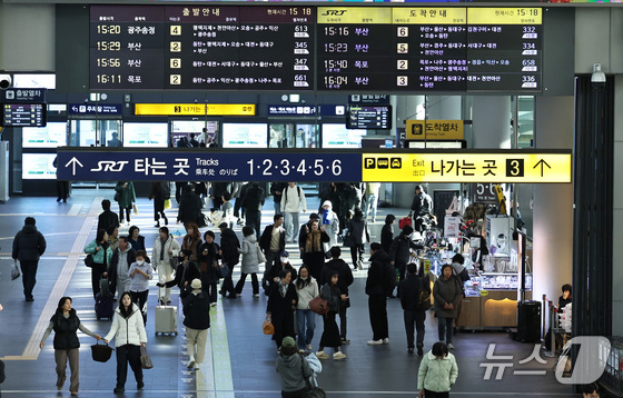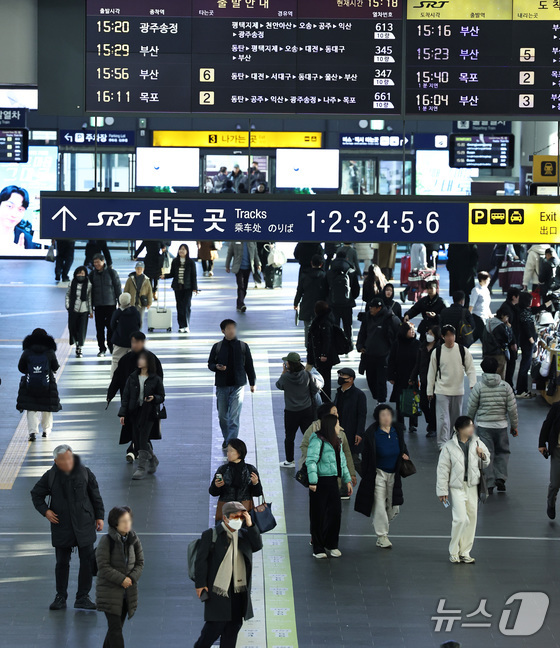 정부가 이원화된 고속철도 KTX와 SRT를 내년 말까지 통합하는 방안을 추진한다. 정부는 우선 내년 3월부터 서울발 KTX-1(20량, 955석) 등 일부를 수서역에 투입한다. 이후 6월에는 KTX와 SRT 열차를 서울역과 수서역을 구분하지 않고 혼합 편성해 운행하는 시범사업을 실시하고, 이후 본격 확대 여부를 결정한다. 사진은 8일 서울 강남구 수서역에서 SRT열차를 이용하는 시민들. 2025.12.8/뉴스1 © News1 구윤성 기자