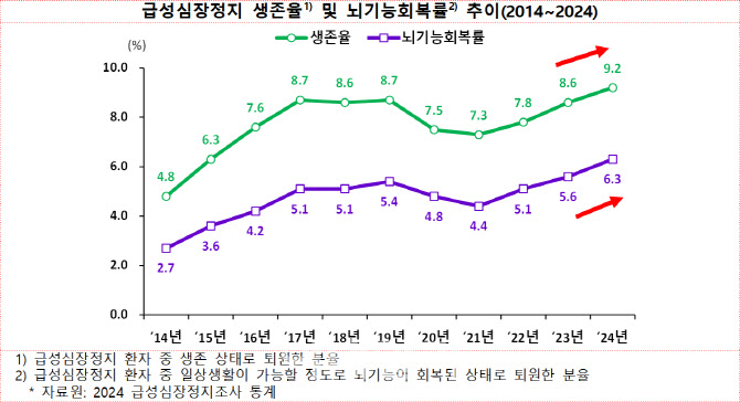 9일 질병관리청이 발표한 ‘2024년 급성 심장정지 통계’에 의하면 지난해 급성 심장정지 환자 생존율은 9.2%, 뇌기능회복률은 6.3%로 전년 대비 각각 0.6%포인트, 0.7%포인트 상승했다. 지난해 환자 생존율은 2014년 조사 시작 이후 가장 높은 수준이다.