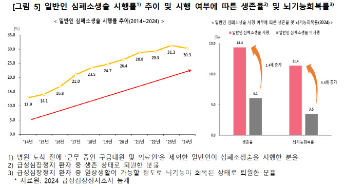 급성심정지 환자 10명 중 3명(30.3%)은 일반인에게 심폐소생술을 받았는데 이 경우 생존율은 14.4%였다. 심폐소생술을 받지 못한 환자(6.1%)보다 생존율이 2.4배 높았다. 뇌기능회복률 또한 일반인이 심폐소생술을 시행한 경우 11.4%, 미시행한 경우는 각각 3.5%로 심폐소생술 시행 시 뇌기능회복률이 3.3배 높았다.