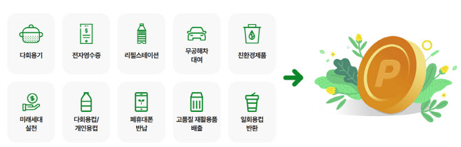 포인트 지급 대상 활동이 5개 추가된다. 나무심기 캠페인 참여 시 3000원, 가정용 베란다 태양광 설치 시 1만원의 포인트를 지급한다. 또 재생원료 사용제품 구매 시 건당 100원, 개인 장바구니 이용 시 회당 50원, 개인용기 식품포장 시 회당 500원의 포인트를 준다.
