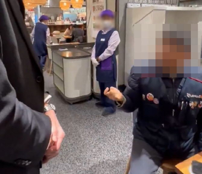 롯데백화점 잠실점 보안요원이 노조 조끼를 착용하고 식당가를 이용하는 손님들에 조끼 탈의를 재차 요구하고 있다. (사진=X.옛 트위터)
