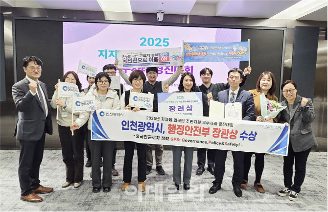 인천시 직원들이 1일 행정안전부 주관의 ‘2025년 지자체 외국인주민 지원 우수사례 경진대회’에서 장려상을 받고 기념 촬영하고 있다. (사진 = 인천시 제공)