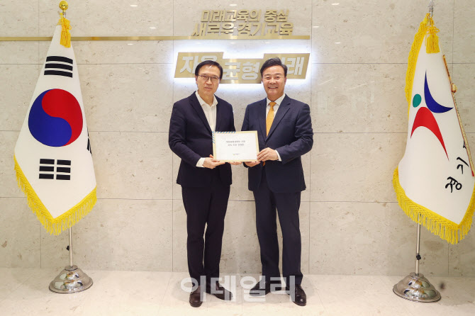12일 경기도교육청을 방문한 김성제 의왕시장이 임태희 경기도교육감에게 의왕교육지원청 신설 신속 추진 건의문을 전달하고 있다.(사진=의왕시)