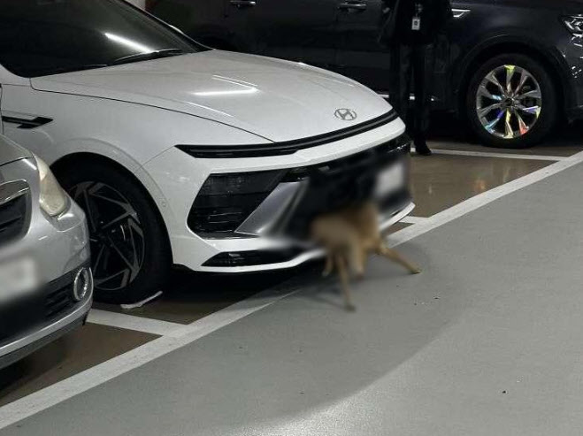 거제 한 아파트 주차장에서 발견된 ‘고라니 사체가 끼인 차량’ 모습.(사진=온라인상)