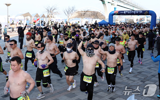 14일 오전 인천 중구 월미도 일대에서 열린 제11회 월미 알몸마라톤대회에서 500여 명의 참가자들은 영하의 날씨에도 상의를 벗은 채 자신의 기량을 선보였다.