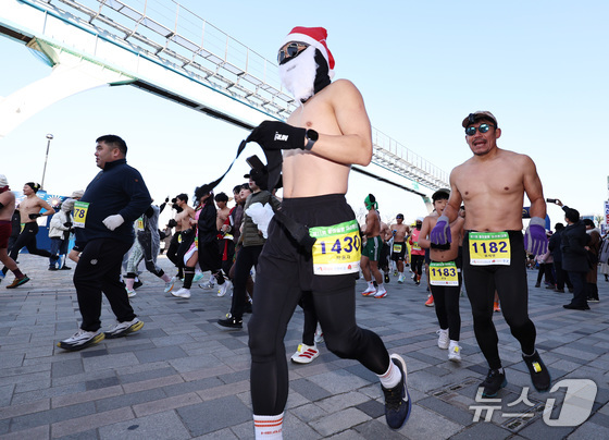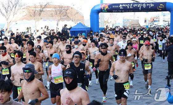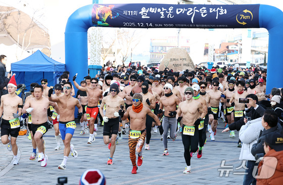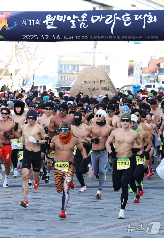 14일 오전 인천 중구 월미문화의거리 일대에서 열린 제11회 월미 알몸마라톤대회에서 참가자들이 힘차게 출발하고 있다. 2025.12.14/뉴스1 © News1 구윤성 기자