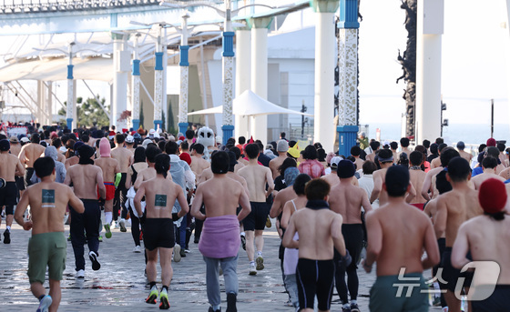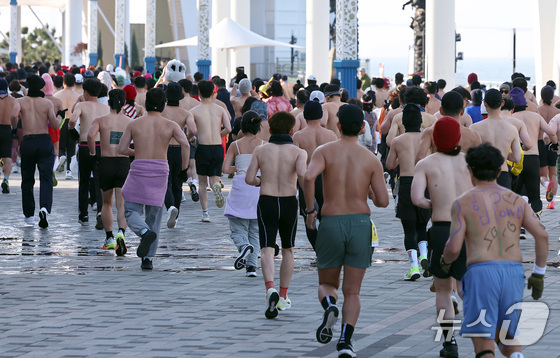 14일 오전 인천 중구 월미문화의거리 일대에서 열린 제11회 월미 알몸마라톤대회에서 참가자들이 출발 준비를 하고 있다. 2025.12.14/뉴스1 © News1 구윤성 기자