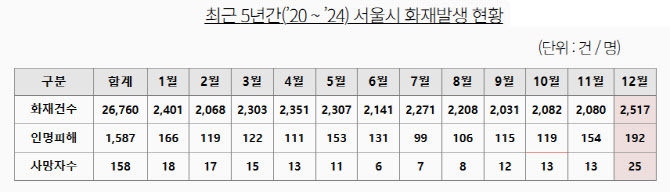 홍영근 서울소방재난본부장은 “12월은 춥고 건조한 겨울철 기후의 영향으로 개인 전열기구 등 난방기기의 사용이 증가함에 따라 화재 발생 위험이 높아지는 시기”라며 “사소한 부주의가 자칫 대형 재난으로 이어질 수 있는 만큼, 겨울철 화재 예방을 위한 시민 여러분의 각별한 주의와 적극적인 관심을 당부드린다”고 말했다.