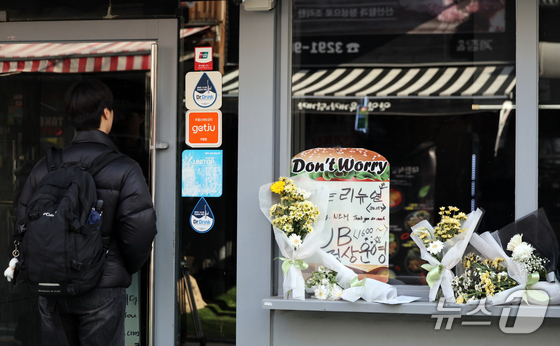 14일 오전 서울 성북구 안암동 영철버거 앞에 영철버거 대표 이영철 씨의 별세 소식을 추모하는 꽃이 놓여져 있다. '고려대 명물'로 통하는 '영철버거' 대표 이 씨는 지난 13일 별세했다. 향년 58세. 고인은 암 투병 중이었던 것으로 알려졌다. 2025.12.14/뉴스1 © News1 황기선 기자