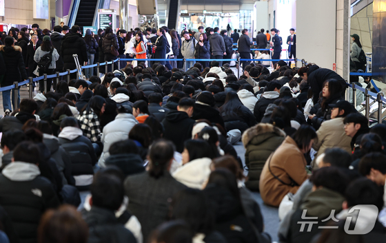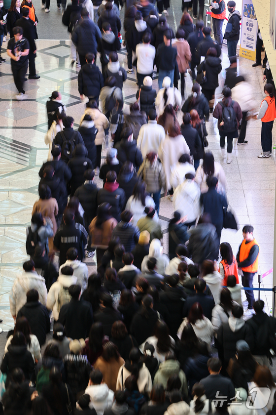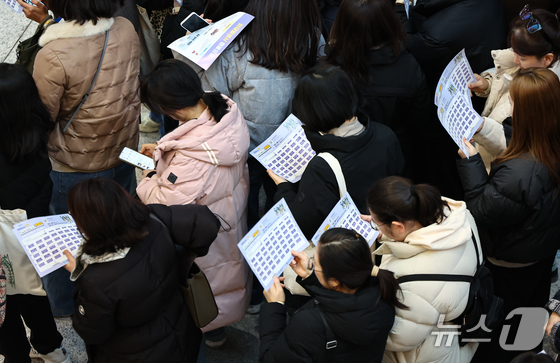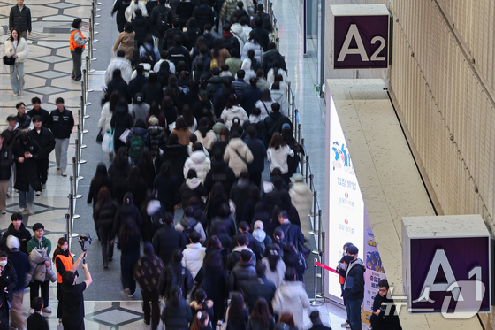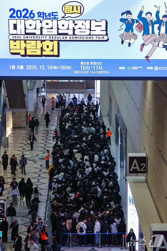 18일 서울 강남구 코엑스에서 열린 2026학년도 정시 대학입학정보박람회를 찾은 학생과 학부모들이 입장을 기다리고 있다. 2025.12.18/뉴스1 © News1 김도우 기자