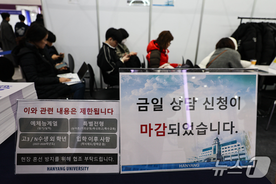 18일 서울 강남구 코엑스에서 열린 2026학년도 정시 대학입학정보박람회에서 한 대학교 부스에 상담 마감 안내문이 게시돼 있다. 2025.12.18/뉴스1 © News1 김도우 기자
