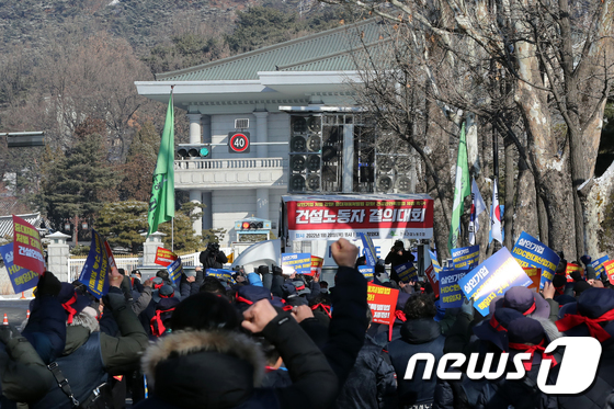 민주노총 건설노조 조합원들이 20일 오전 서울 종로구 청와대 사랑채 앞에서 열린 '건설노동자 결의대회'에서 구호를 외치고 있다. 건설노조는 이날 결의대회를 통해 '중대재해처벌법 강화와 건설안전특별법 제정'등을 촉구했다. 2022.1.20/뉴스1 © News1 황기선 기자