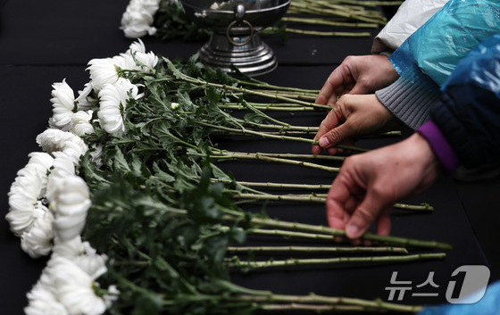 20일 오후 서울 종로구 보신각 앞에서 열린 '12·29 무안공항 제주항공 여객기 참사 1주기 전국 시민 추모대회'에서 추모객들이 헌화하고 있다. 2025.12.20/뉴스1 © News1 구윤성 기자