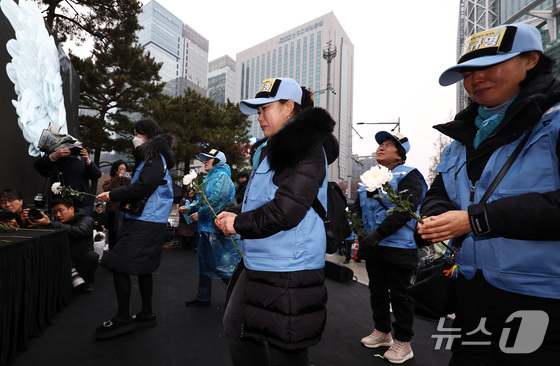 20일 오후 서울 종로구 보신각 앞에서 열린 '12·29 무안공항 제주항공 여객기 참사 1주기 전국 시민 추모대회'에서 여객기 참사 유가족들이 헌화하고 있다. 2025.12.20/뉴스1 © News1 구윤성 기자