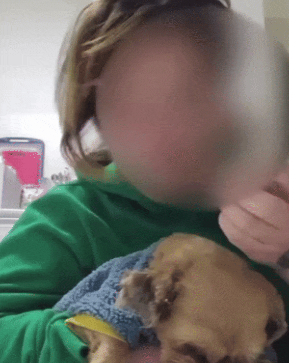 강아지는 담배 연기가 싫은 듯 경직된 표정으로 고개를 계속 돌렸고, 힘없이 축 늘어져 있었다. 발톱은 길게 자랐고, 눈물이 계속 흘러 굳은 눈물자국이 진하게 남아 있는 등 기본적인 관리도 받지 못한 것으로 보였다.