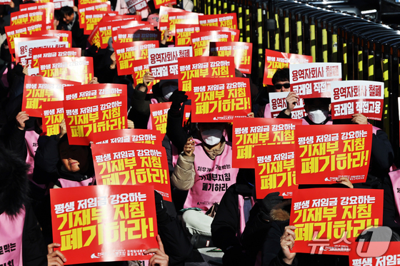 민주노총 전국철도노조 코레일네트웍스지부, 철도고객센터지부 소속 조합원들이 22일 오후 서울 용산구 코레일네트웍스 본사 앞에서 총파업 결의대회를 진행하고 있다. 2025.12.22/뉴스1 © News1 황기선 기자