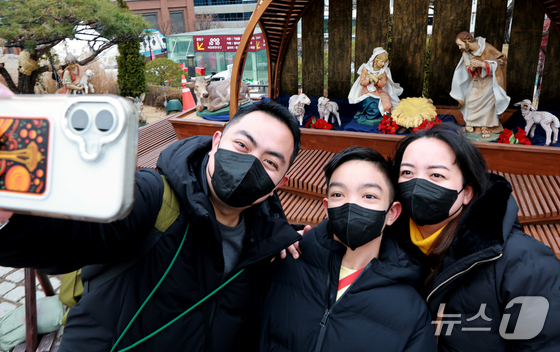 크리스마스 이브를 하루 앞둔 23일 서울 중구 명동대성당 앞에 설치된 성탄 구유에서 외국인 관광객들이 기념사진을 찍고 있다. 2025.12.23/뉴스1 © News1 이호윤 기자