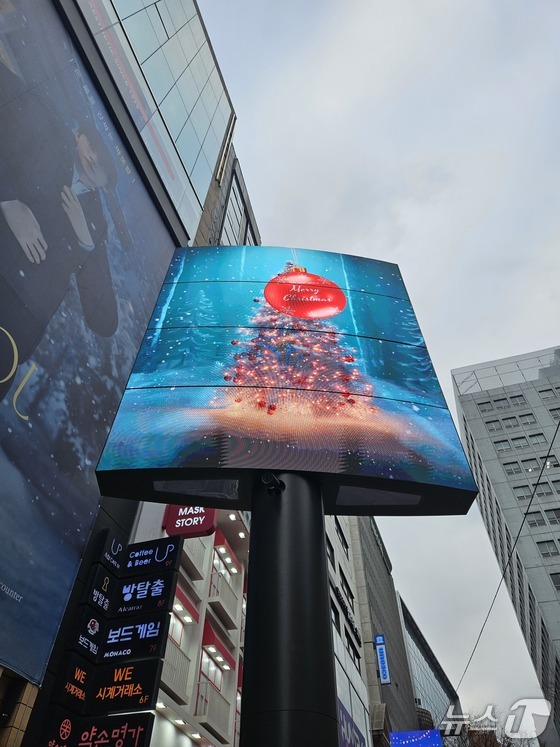 24일 서울 명동 거리 전광판에 크리스마스 트리 이미지가 떠 있다. 2025.12.24/© 뉴스1 유채연 기자