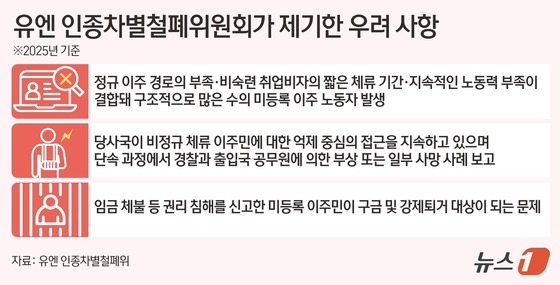 유엔 인종차별철폐위원회(위원회)는 2018년에 이어 올해에도 구조적으로 미등록 이주노동자가 발생할 수밖에 없는 구조를 방치한 채 단속·억제 중심의 정책을 펴는 정부에 대해 문제를 제기하고 우려를 표했다.