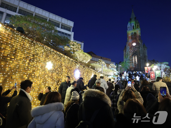 크리스마스 이브인 24일 서울 중구 명동성당 외벽에 아기예수의 탄생을 축하하는 미디어파시드가 펼쳐지고 있다. 2025.12.24/뉴스1 © News1 황기선 기자