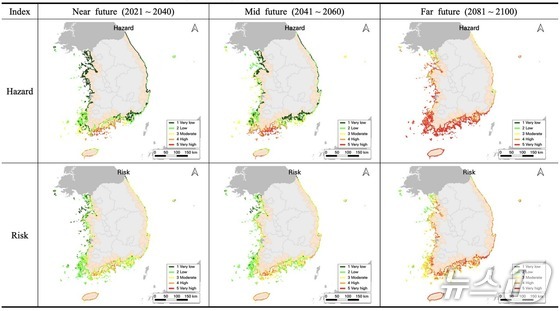 한반도 동·서·남해안의 미래 기간별 위험 평가 분석 결과(한국기후변화학회 제공) © 뉴스1