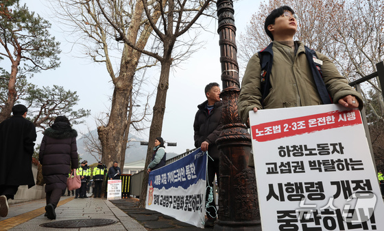 민주노총 조합원들이 29일 오전 서울 종로구 청와대 앞에서 노조법 2·3조 시행령 개정 중단을 촉구하는 선전전을 펼치고 있다. 2025.12.29/뉴스1 © News1 장수영 기자