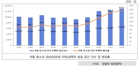 지난해 만 20세 이하 아동·청소년 대상 성폭력범죄 입건 건수는 1만 3092건으로 전년 대비 5.5% 증가했으며 이 수치는 2020년 이후 증가 추세에 있는 것으로 나타났다.