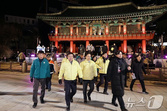 윤호중 행정안전부 장관이 31일 오후 서울 종로구 보신각 제야의 종 타종행사를 앞두고 일대 인파관리대책 등 안전 현장점검을 하고 있다. (행정안전부 제공. 재판매 및 DB 금지) 2025.12.31/뉴스1