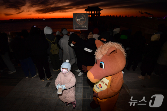 2026년 병오년 새해 첫 날인 1일 경북 포항시 영일대해수욕장 해상누각 앞에서 적토마 인형 옷을 입은 포항불교사암연합회원이 어린이들에게 가래떡을 나눠주고 있다. 2026.1.1/뉴스1 © News1 최창호 기자