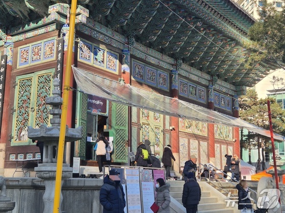 이날 오전 10시쯤 서울 종로구 조계사에는 롱패딩과 장갑, 목도리 등으로 무장한 시민들로 북적였다. 조계사 입구엔 '소원이 이루어지는 발원의 북을 울려 주세요'라고 적힌 안내와 함께 북이 설치됐다. 시민들은 길게 줄을 서 북을 친 뒤 합장했다.