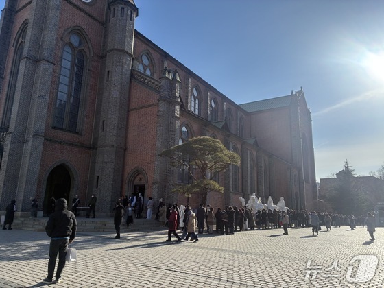 서울 중구 명동성당에도 마스크, 롱패딩, 장갑 등 방한용품으로 몸을 감싼 시민들이 장사진을 이뤘다. 다음 시간 미사를 기다리는 시민들이 추위 속에서 발을 동동 구르기도 했다.