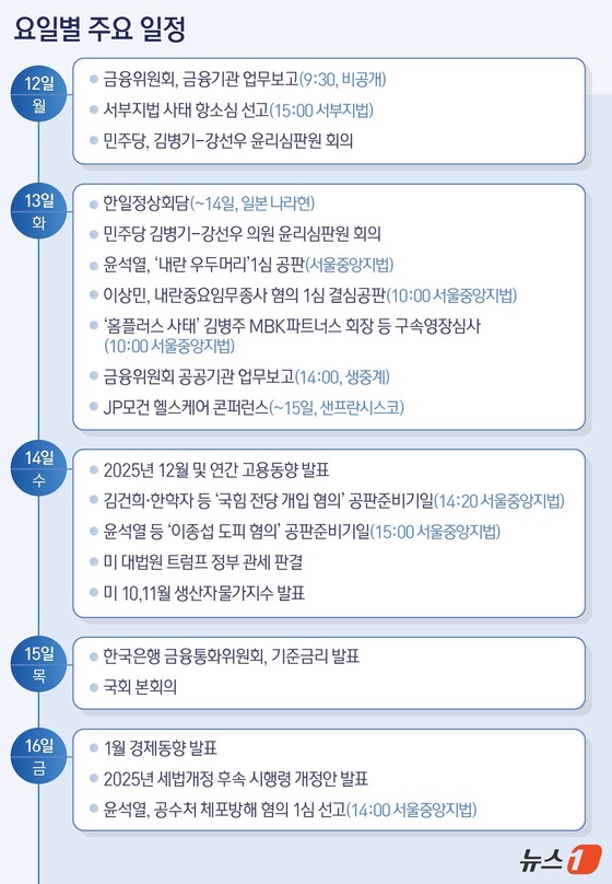 한편 윤 전 대통령의 고위공직자범죄수사처(공수처) 체포영장 집행 방해 및 국무위원 심의권 침해 혐의에 대한 1심 선고도 이번주에 나온다. 서울중앙지법 형사합의35부(부장판사 백대현)는 16일 오후 2시부터 특수공무집행방해 등 혐의로 기소된 윤 전 대통령에 대한 선고기일을 연다. 내란 특검팀은 지난달 26일 윤 전 대통령에게 징역 10년을 구형한 상태다. 특히 이번 선고는 지난해 12·3 비상계엄 이후 윤 전 대통령이 기소된 사건 가운데 처음으로 나오는 1심 판단이다.