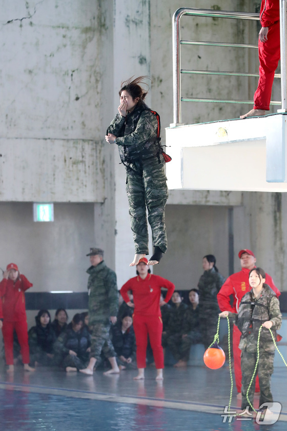 13일 경북 포항 해병대 1사단에서 열린 '2026년 겨울 해병대 캠프' 참가자들이 인천상륙관에서 비상시 함정을 탈출하는 이함훈련과 IBS(소형고무보트) 체험을 하고 있다. 2026.1.13/뉴스1 © News1 공정식 기자