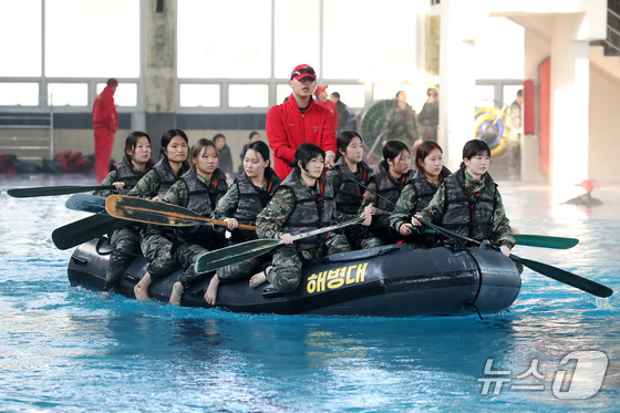 13일 경북 포항 해병대 1사단에서 열린 '2026년 겨울 해병대 캠프' 참가자들이 인천상륙관에서 IBS(소형고무보트) 체험을 하고 있다. 2026.1.13/뉴스1 © News1 공정식 기자