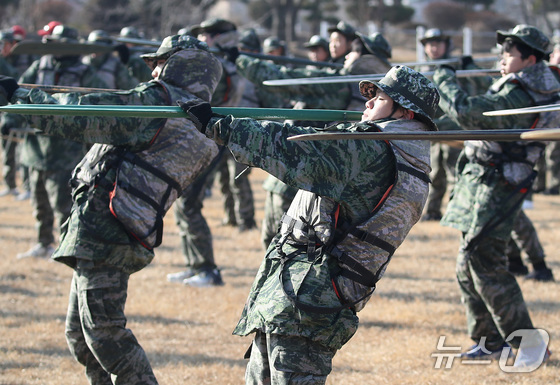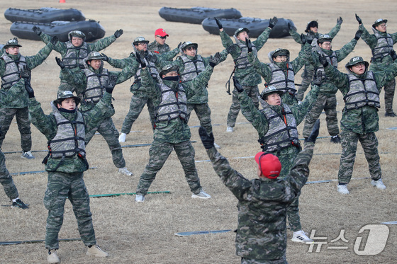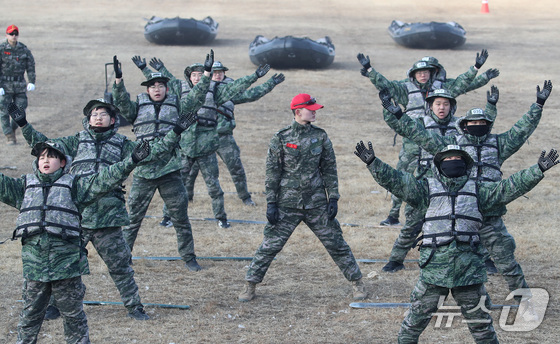 13일 경북 포항 해병대 1사단에서 열린 '2026년 겨울 해병대 캠프' 참가자들이 연병장에서 육상 패들링을 연습하고 있다. 2026.1.13/뉴스1 © News1 공정식 기자