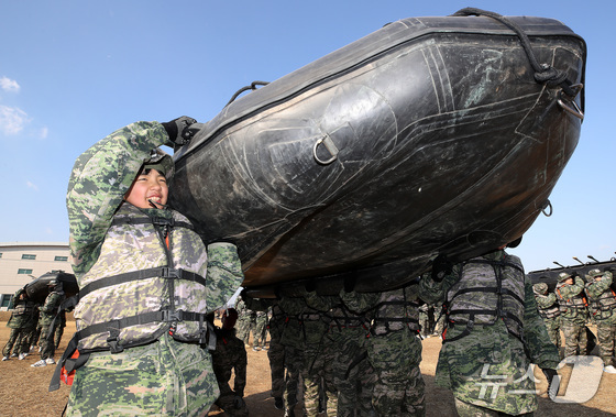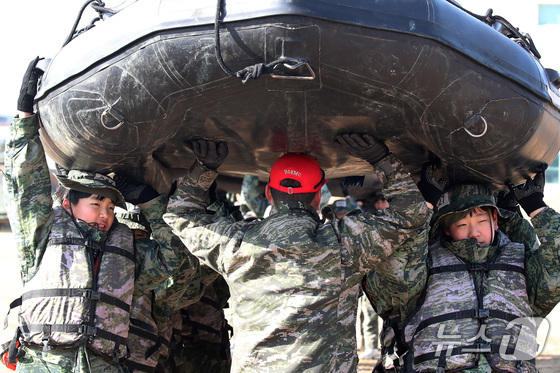 13일 경북 포항 해병대 1사단에서 열린 '2026년 겨울 해병대 캠프' 참가자들이 연병장에 IBS(소형고무보트) 도수운반 훈련을 하고 있다. 2026.1.13/뉴스1 © News1 공정식 기자