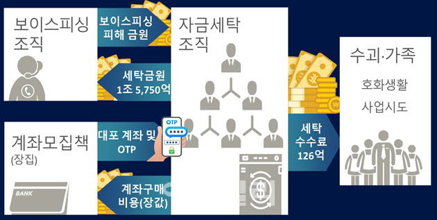 이 조직은 기업형 범죄조직으로 △두목△총괄 관리책△중간 관리책△전문장집(대포통장 모집책)△조직원 모집책△자금 세탁책으로 구성됐다. 두목과 조직원들은 모두 20~40대 MZ세대였다. 보이스피싱 범죄조직이 피해금을 입금하면 이들은 자금을 세탁하고 ‘세탁 수수료’를 챙겼다. 대포통장 모집책에게 속칭 ‘장값’이라 불리는 계좌 구매 비용을 지급하고, 대포 계좌와 실물형 일회용비밀번호생성기(OTP)를 받았다.