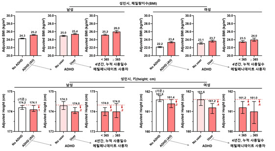 소아에서 ADHD 진단 및 메틸페니데이트 사용 여부에 따른 성인기 BMI와 키: ADHD 진단군에서 BMI가 더 높았고, 메틸페니데이트 장기 사용군에서 그 경향이 두드러졌다. 키는 메틸페니데이트 사용군에서 소폭 낮았으나 차이는 크지 않았다.