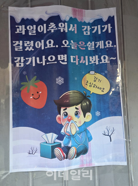 21일 서울 동작구 상도동 성대전통시장 내 한 청과물 매장에 붙은 안내문.(사진=김현재 기자)