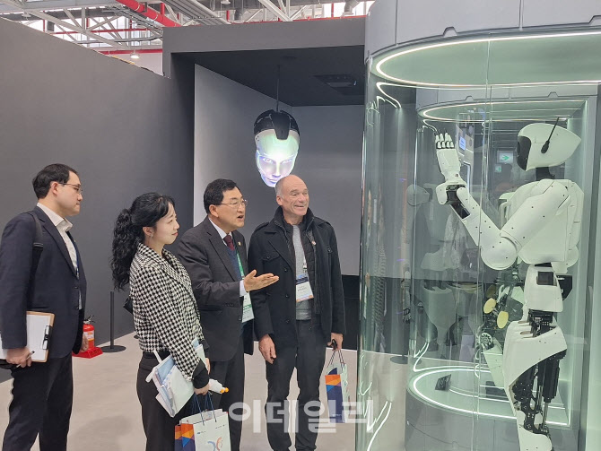 주낙영(왼쪽 세번째) 경주시장이 해외 관계자들과 함께 첨단 로봇 기술이 적용된 전시 제품을 살펴보며 설명을 듣고 있다.(사진=경주시)