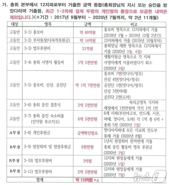 C 부장은 2020년 3~7월 법무 후원비 등 명목으로 세 차례 5억8000만 원을, B 부장의 경우 2020년 8월 당시 총회 총무 대행이라는 직책으로 활동하며 개인 후원금을 거둬들인 것으로 파악됐다.