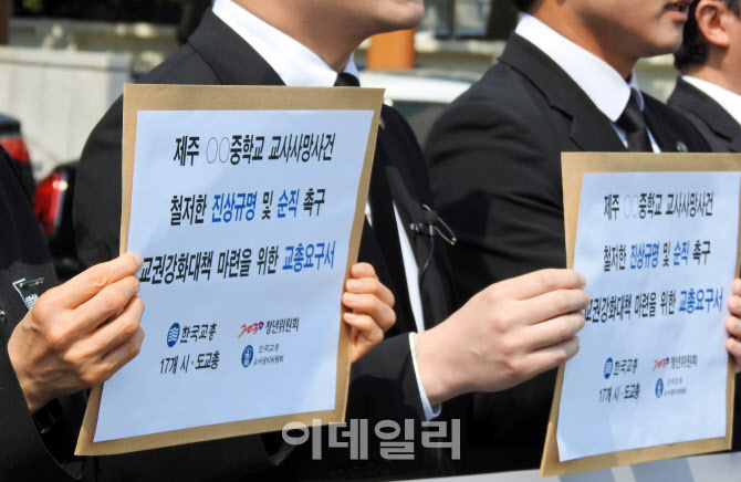 한국교원단체총연합회가 지난해 5월 제주도교육청에서 고 현승준 교사 진상규명 및 명예회복, 교권 보호 대책 마련 기자회견을 하고 있다. (사진=뉴시스)