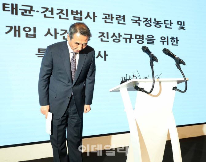 [이데일리 김태형 기자] 민중기 특별검사가 29일 오전 서울 종로구 KT광화문빌딩 특검 브리핑실에서 김건희 여사 각종 의혹 관련 최종 수사 결과 브리핑을 마치고 인사를 하고 있다.
