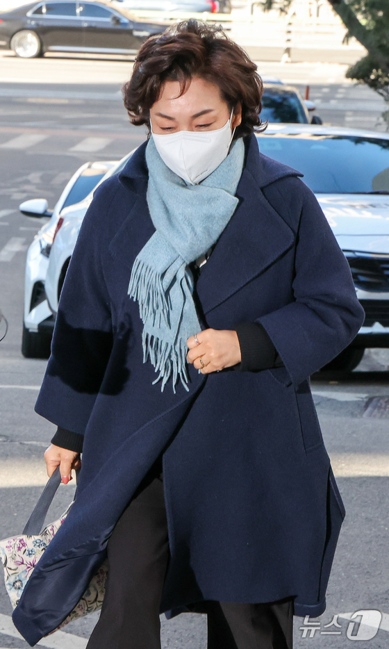 김병기 무소속 의원의 배우자 이예다 씨가 22일 오후 마포구 서울경찰청 공공범죄수사대에서 법인카드 유용 의혹과 관련 피의자 신분으로 조사를 받기 위해 출석하고 있다. © News1 안은나 기자