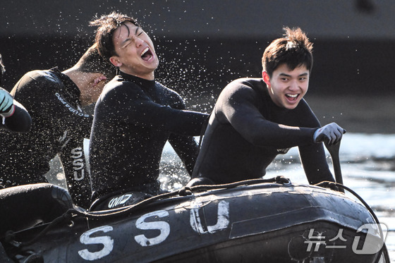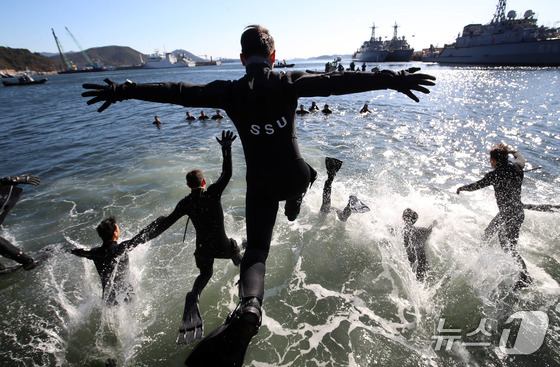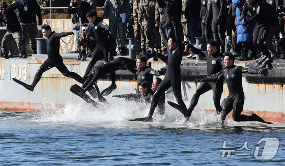 전국적으로 맹추위가 기승을 부린 22일 경남 창원 진해 군항에서 해군 심해잠수사(SSU)들이 차가운 겨울 바다로 뛰어들며 혹한기 훈련을 하고 있다. 2026.1.22/뉴스1 © News1 윤일지 기자