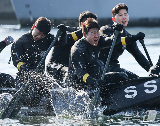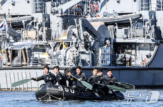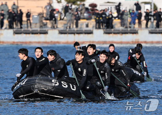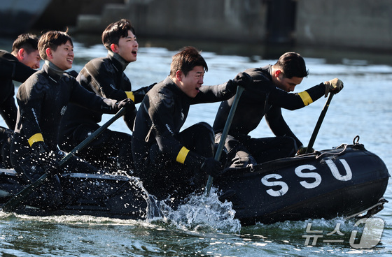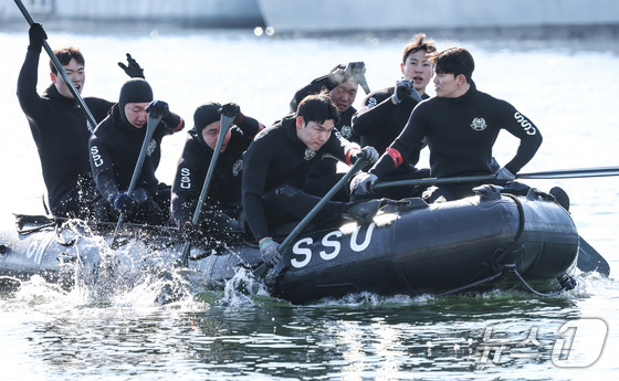 해군 특수전전단 해난구조전대(SSU) 심해잠수사들이 22일 경남 창원 진해군항에서 열린 혹한기 내한 훈련 중 고무보트 패들링을 하고 있다. (공동취재) 2026.1.22/뉴스1 © News1 윤일지 기자